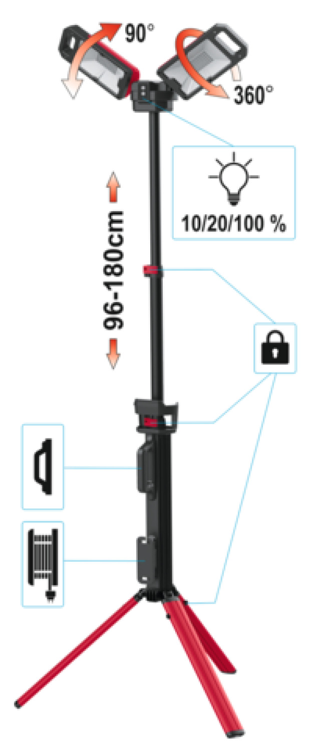 Kokkupandav Yato akumulaatoriga prožektor, mille maksimaalne väljundvõimsus on 5000lm. Kolm erinevat töörežiimi ja kaks erinevat valgusvärvi võimaldavad kohandada valgustust vastavalt teie tegevusele ja aku tasemele. Kaasas on võimas 7,2V 4000mAh liitiumioonaku, mis tagab tööaegade vahemikus 1 kuni 5 tundi, ning pidev töö on võimalik alates vahelduvvoolu toiteallikast. Täiendav eelis on reguleeritav valgustuse nurk ja statiivi kõrgus.