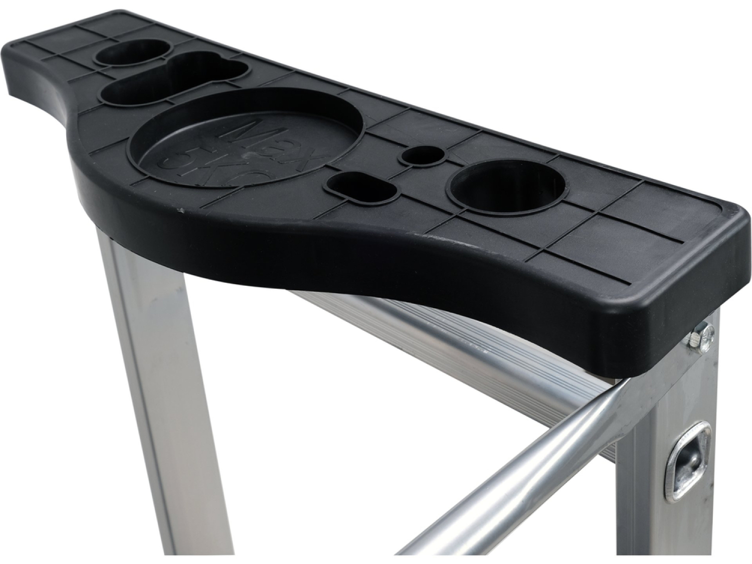 - Viršutinėje pakopos dalyje yra tvirtinimas saugiam įrankių ar dažų talpyklų laikymui