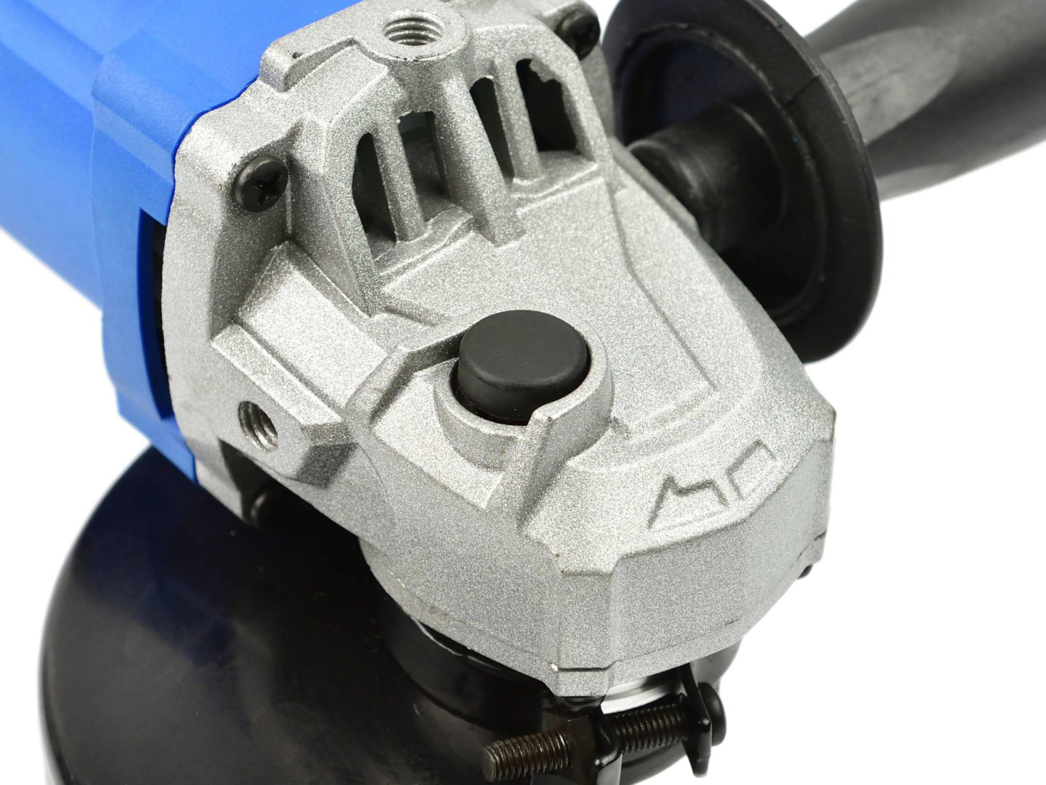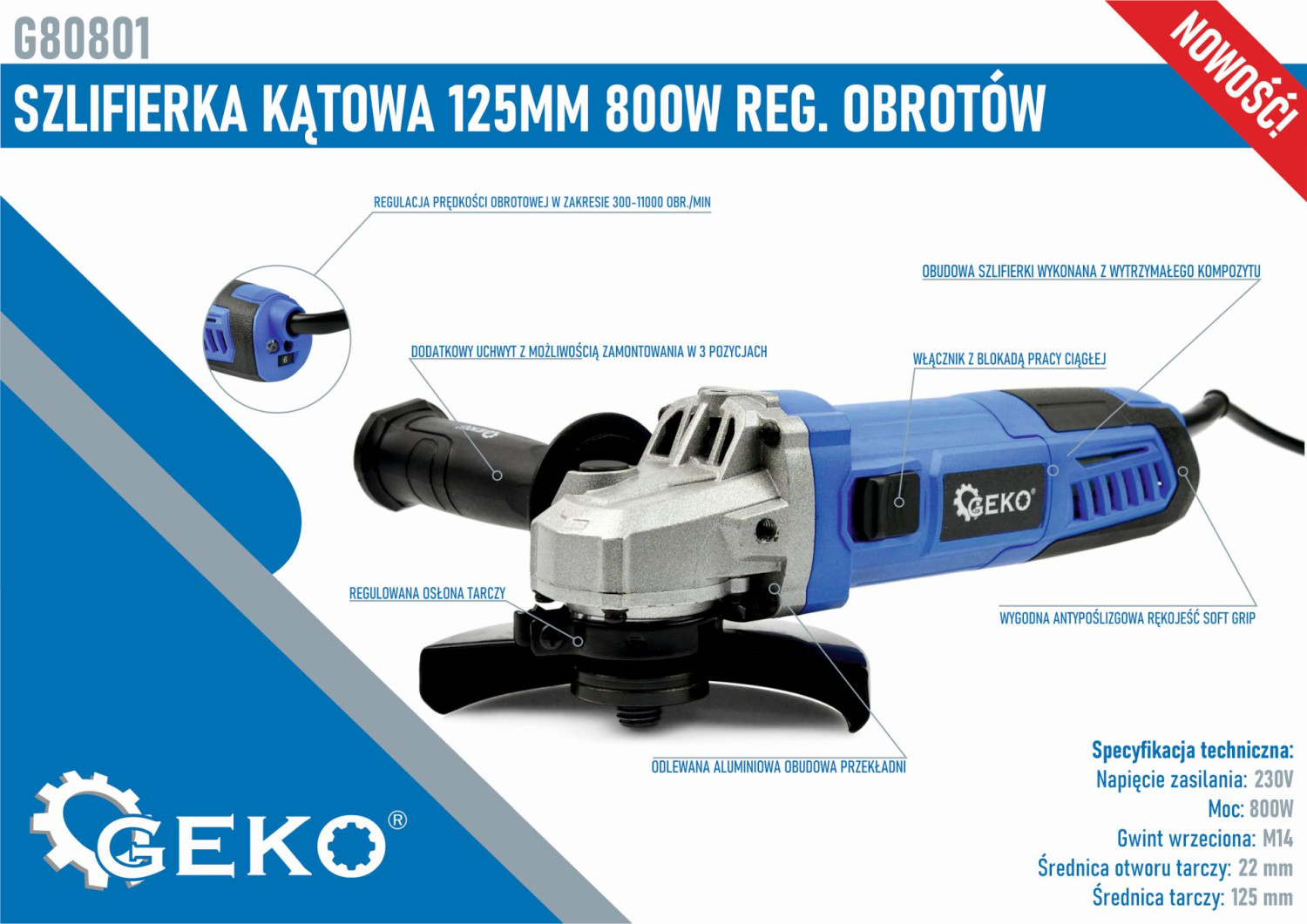 Leņķa slīpmašīna 125mm ar 800W jaudas elektrisko motoru. Šī slīpmašīna piedāvā iespēju uzstādīt rokturi trīs dažādās pozīcijās, kas nodrošina ērtu darbu gan labročiem, gan kreiļiem. 6 pakāpju apgriezienu regulēšana (3000-11000 RPM) nodrošina precīzu dažādu materiālu apstrādi. Vārpstas bloķēšanas mehānisms ļauj ātri un viegli nomainīt slīpēšanas disku. Slīpmašīna izgatavota no augstas kvalitātes materiāliem.