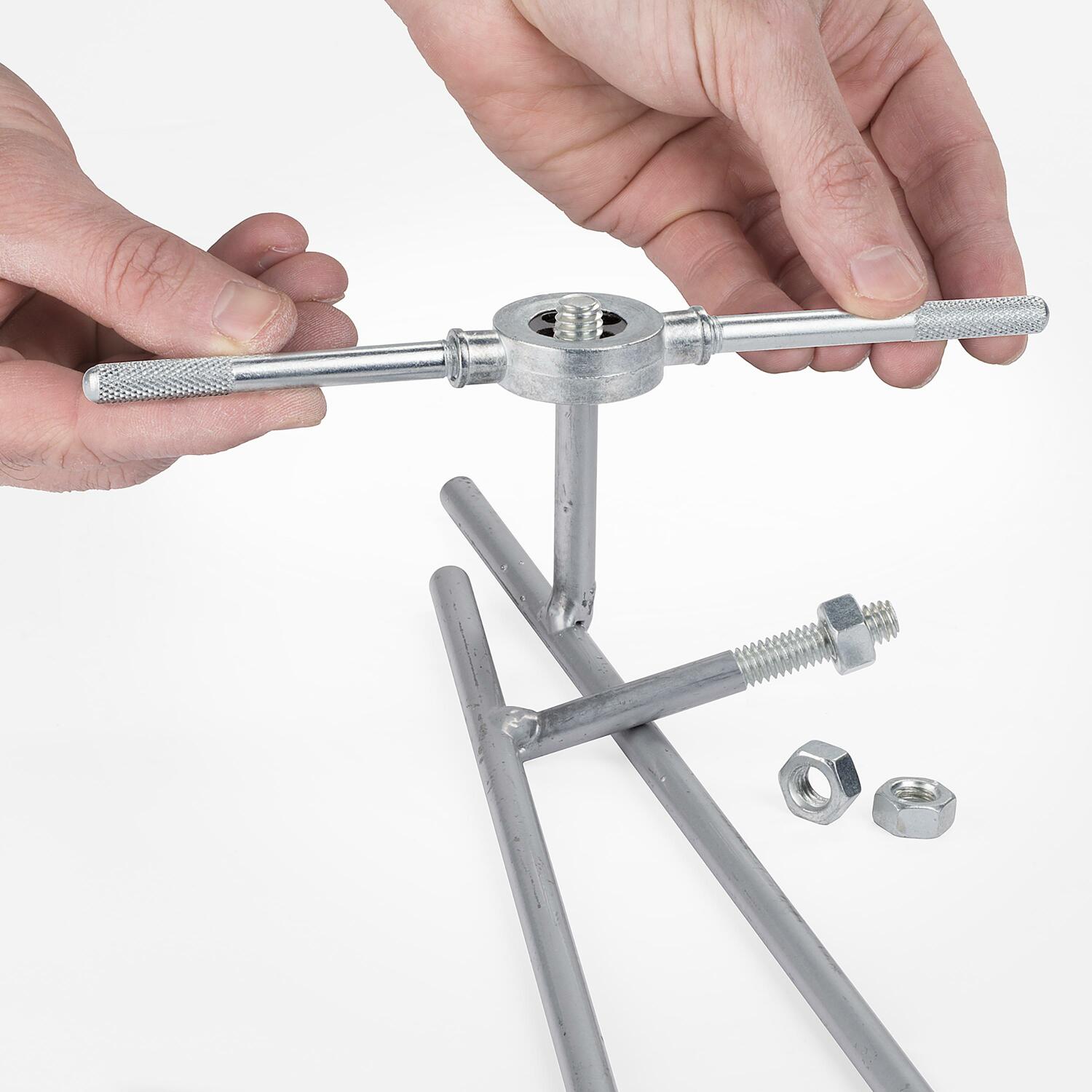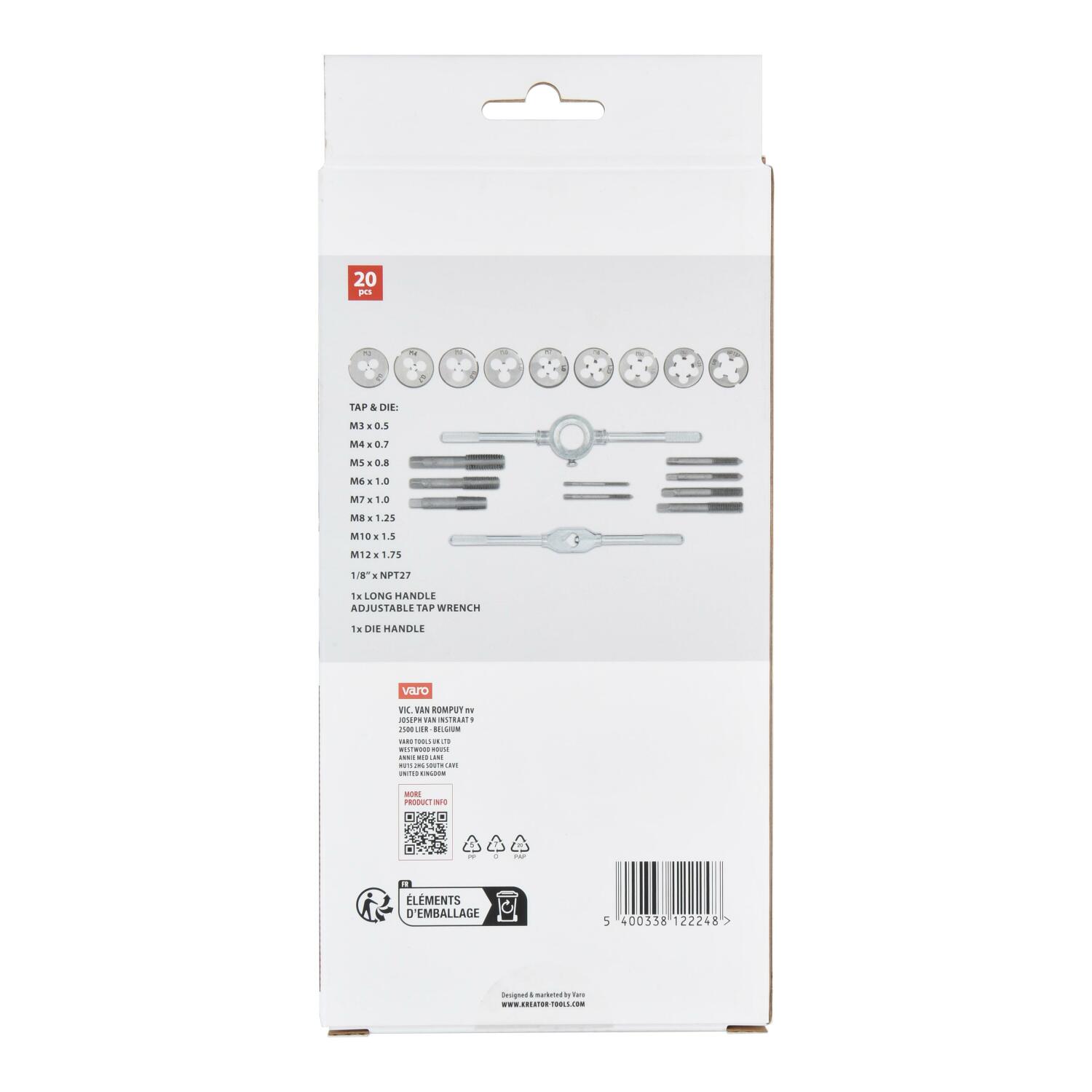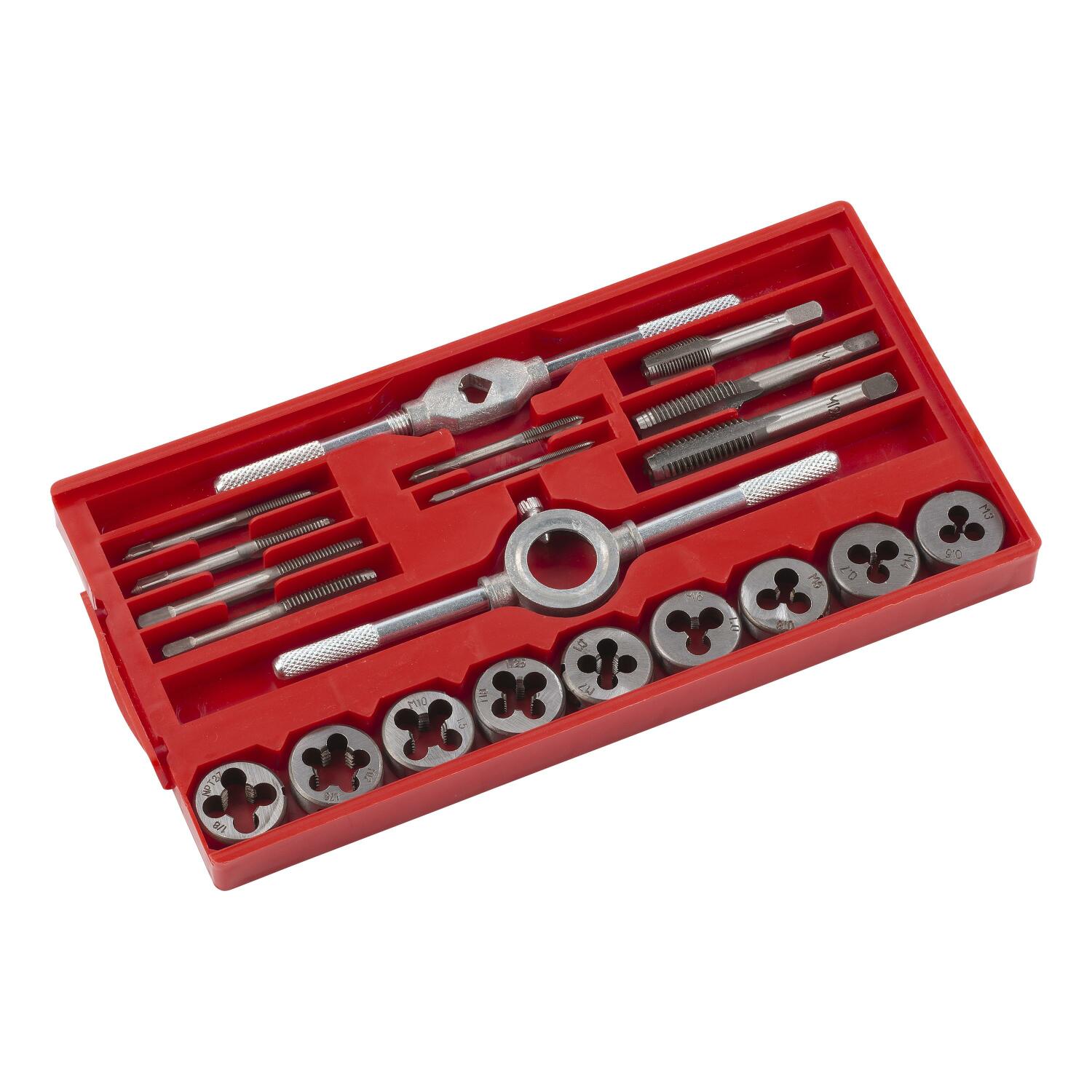 Kasutage seda 20-osalist KREATOR tap ja die komplekti, et hõlpsasti luua sisekeermestikke (mutrite jaoks) ja väliskeermestikke (poltide jaoks). Komplekt on ideaalne kahjustatud keermete parandamiseks või uute lõikamiseks.